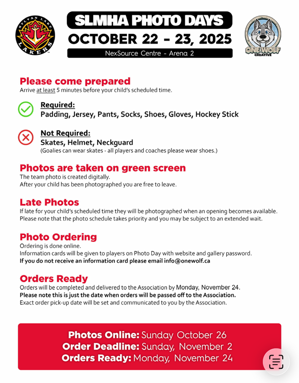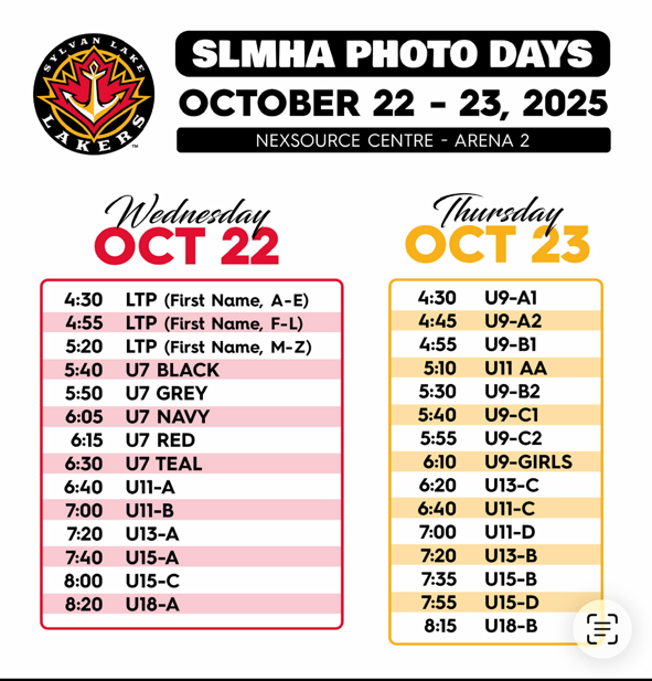 Minor Hockey Photos By SLMHA | October 20, 2025 Sylvan Lake Minor Hockey photos take place October 22 & 23, 2025. See the images below to find out when your team gets their photos snapped, and what you need to know. Posted in Association News